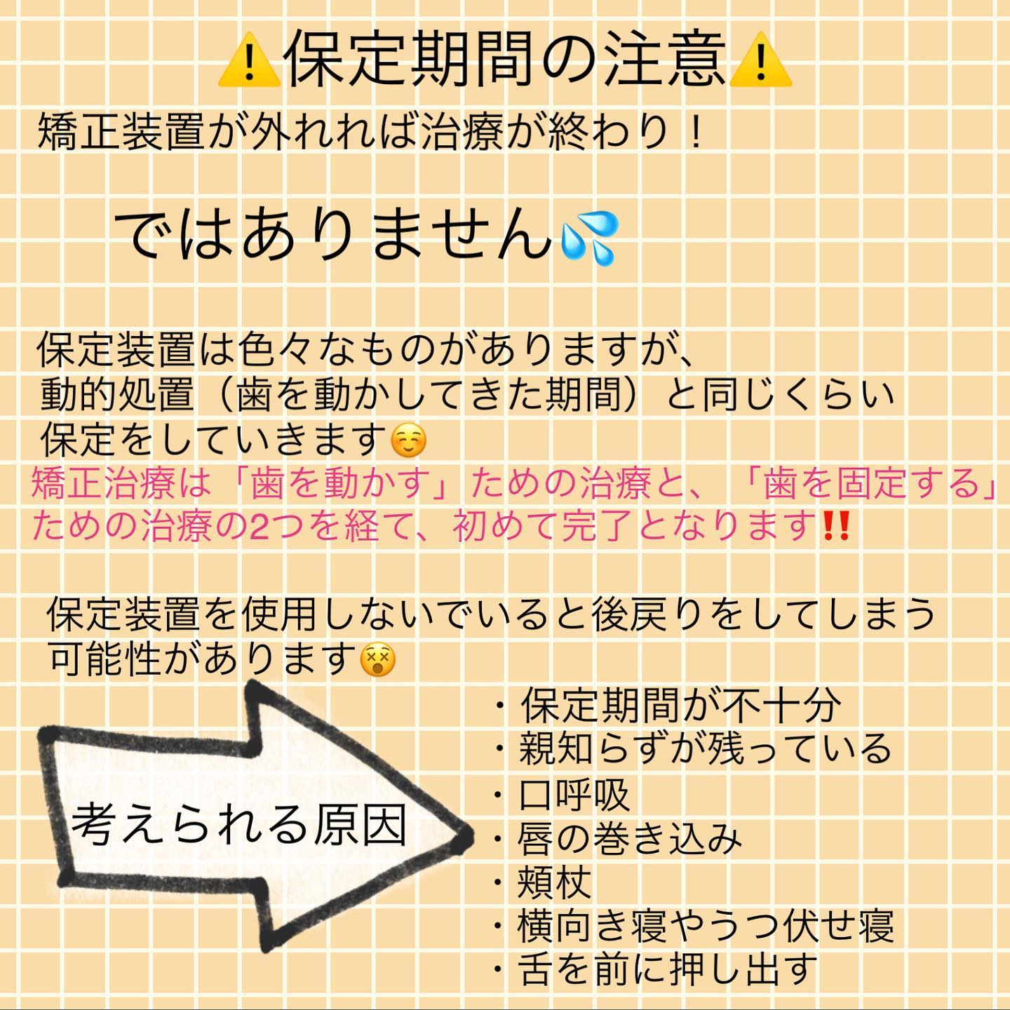 こんにちは️日中はだいぶ暖かくなってきましたね春のお花も沢山咲いてきていますね当院でも矯正治療を終えて保定期間にはいる患者様が増えてきました❣️矯正期間が終われば、治療が終わりだと思われる方もいるかも知れません動的治療同様に、保定期間も大切になってきますので、気を抜かずご協力をお願いします保定装置をしていなかったり、舌が正しい位置にないと後戻りを起こしてしまいます舌の正しい位置=スポット矯正治療で歯を動かした期間と同じ期間保定装置をしっかりはめましょ... -