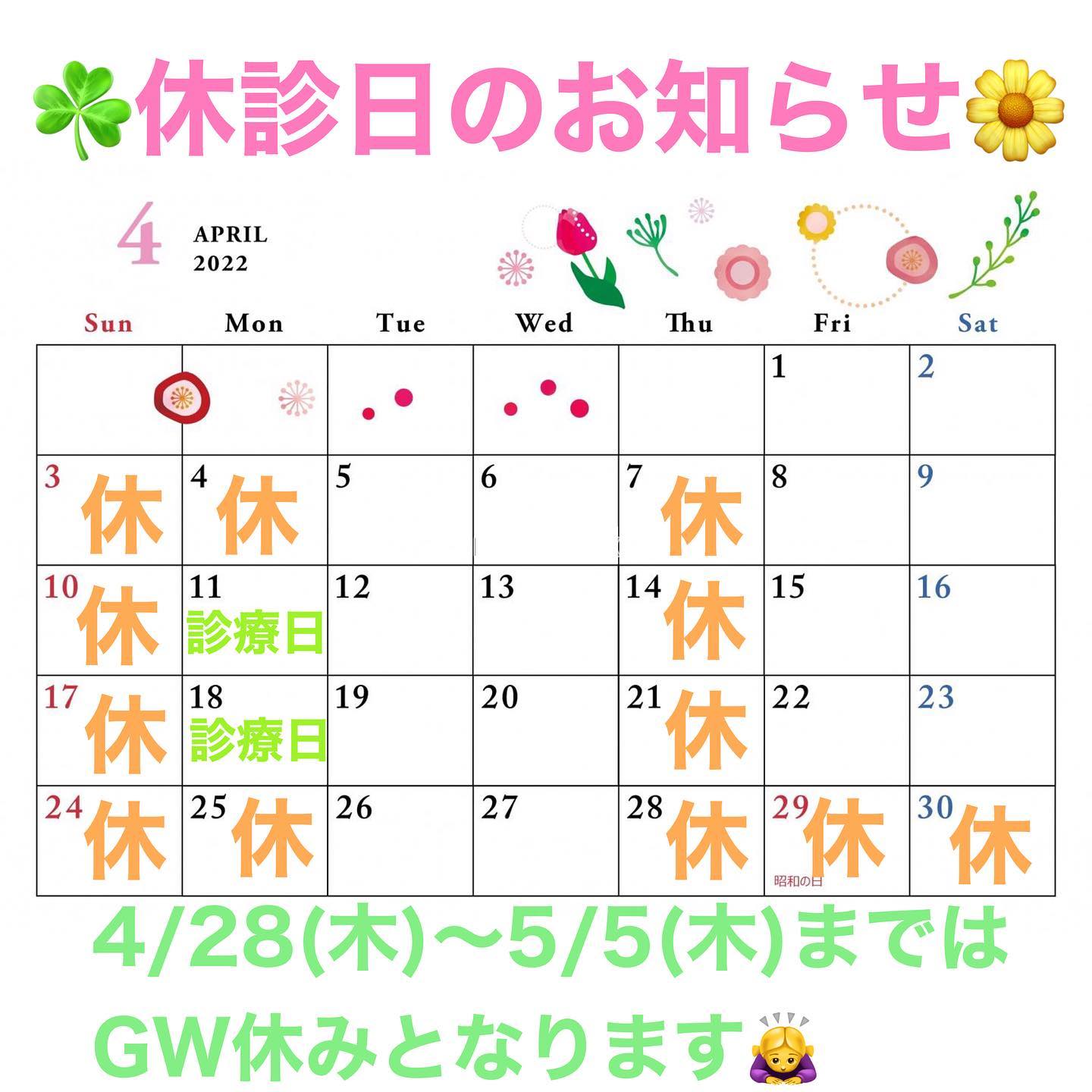.こんにちは🏻お花見や日向ぼっこが気持ちいい季節になりましたね4月診療日のお知らせです11日(月)、18日(月)は診療日となり、28日(木)〜5月5日まではGW休みとなります宜しくお願い致します!#矯正歯科クリニック柏の葉#矯正専門医#マウスピース矯正#表側矯正 #裏側矯正#拡大矯正 #小児矯正#柏の葉キャンパス駅 #徒歩4分#人生がときめく矯正を#山崎 -