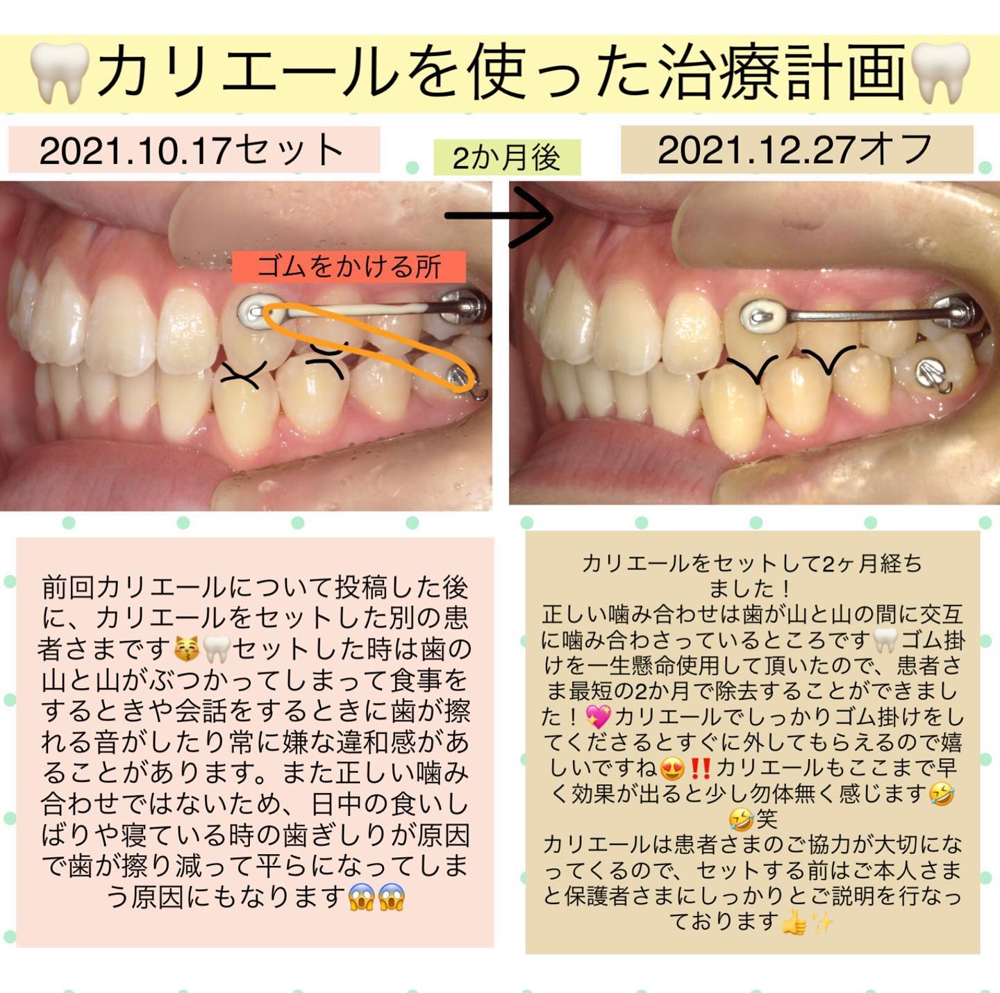 こんにちは🦷少し前にカリエールについての投稿をさせて頂きました!そして年末にカリエールを除去した患者さまがかなり変化していたので取り急ぎ投稿します初めてカリエールをセットしたのは2021年の10月ごろでしたが2か月後にチェックしたところなんと除去へ🏻🏻カリエールの設置期間はマウスピース到着までの約3か月でした!カリエールは大体半年〜1年未満の期間でゴム掛けをしてもらうことが多いです!ゴムをかける時間と、ゴムの強さは患者さまごとに変わってくるので、しっかりゴ... -