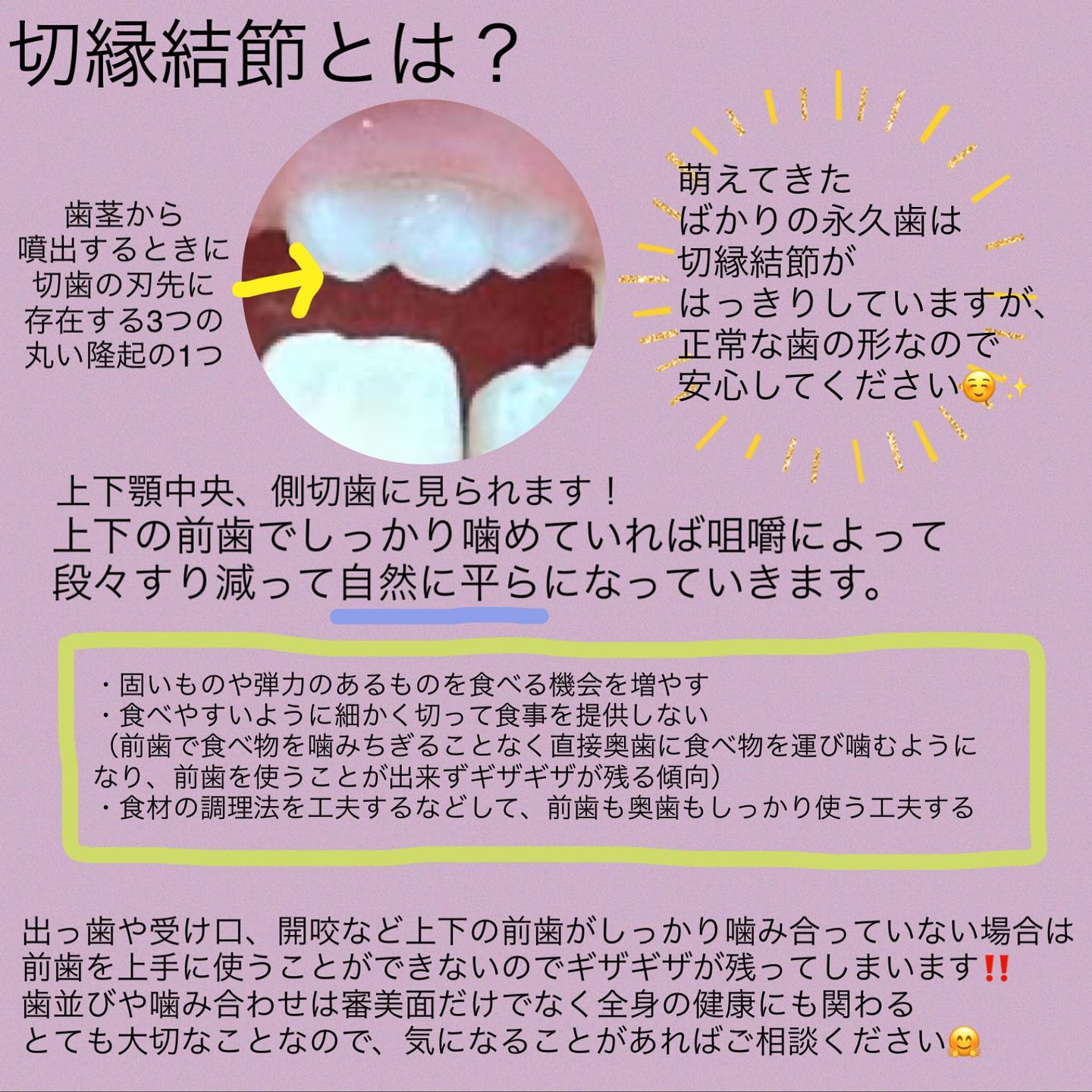 こんにちは昨日は節分でしたね❣️恵方巻は食べましたか?そして今日は立春ですね春に向かって早く暖かく過ごしやすい季節になるといいでね️みなさん切縁結節という言葉は聞いたことありますか🤔?主に上下顎中央、側切歯の萌えたての永久歯は先端がギザギザしています️専門用語では「切縁結節(せつえんけっせつ)」といいます🤗歯は発育過程において先の部分から石灰化が始まります🦷その石灰化の始まり部分を「発育葉」といい、切歯(前歯)は近心葉・中心... -