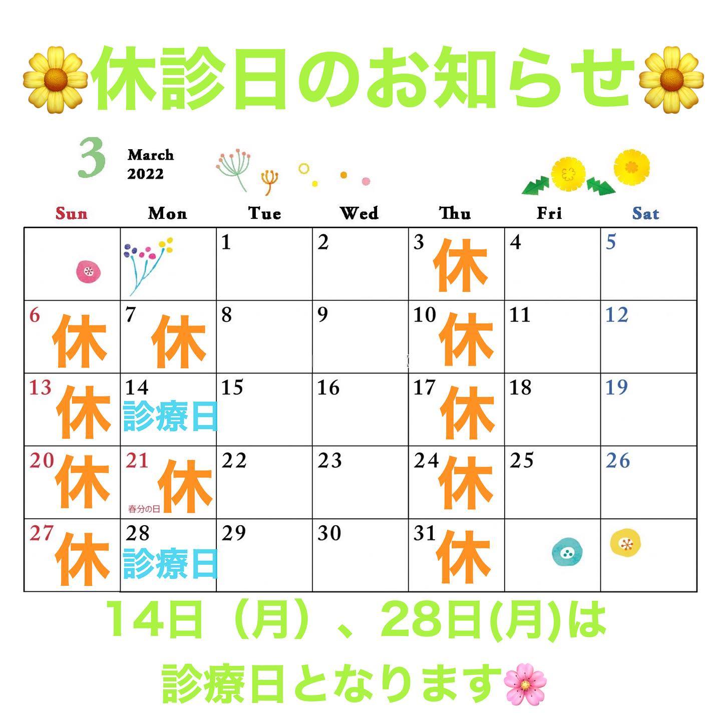 .こんにちは🏻2月も半分が終わりましたね!少しずつ暖かくなって春を感じます️3月診療日のお知らせです!14日(月)、28日(月)は診療日となります️宜しくお願い致します🏻#矯正歯科クリニック柏の葉#矯正歯科医#マウスピース矯正 #表側矯正 #裏側矯正#小児矯正 #拡大矯正#柏の葉キャンパス駅 #徒歩4分#人生がときめく矯正を#山崎 -