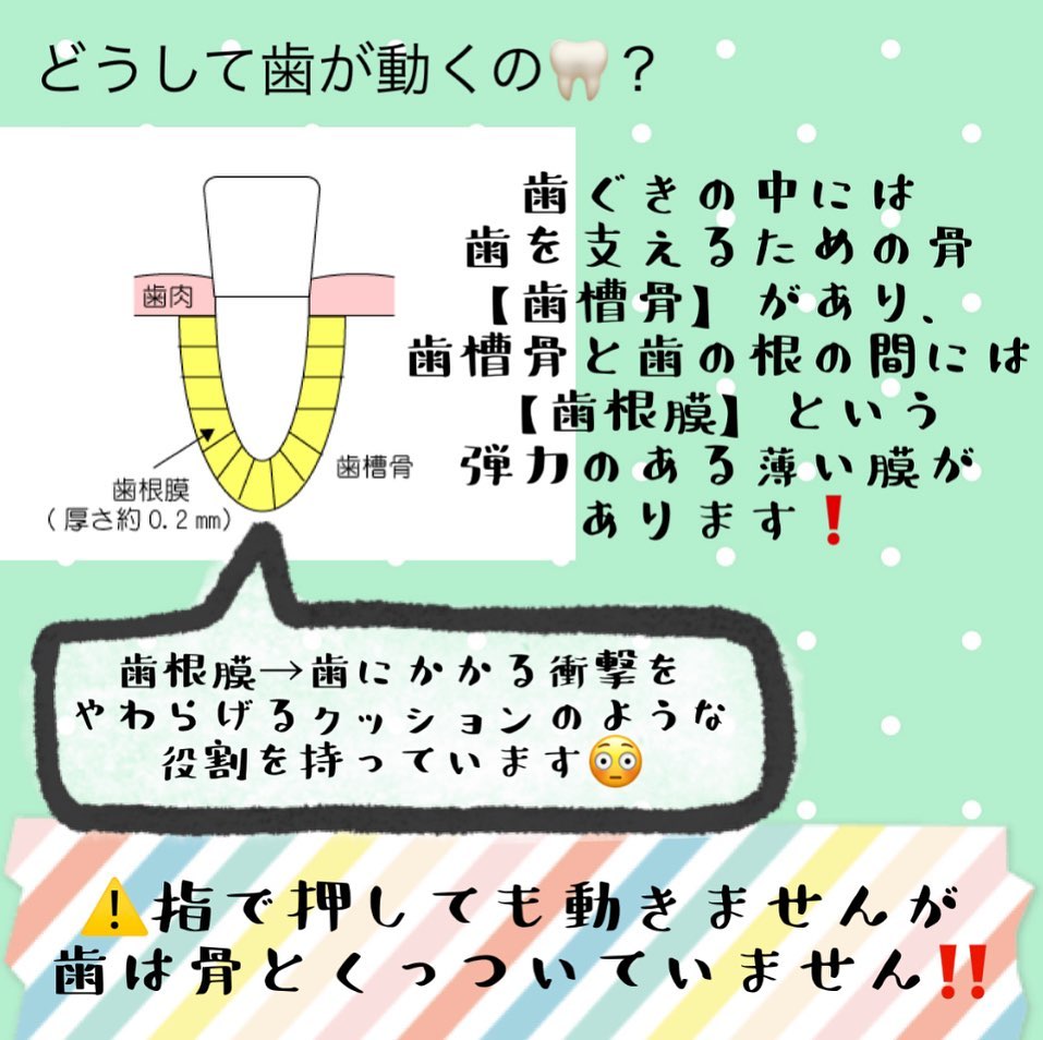 こんにちはあっという間に2月も終わりに近づいてきましたねまだまだ寒いですが、体調に気を付けましょう矯正治療の歯の動かし方についてお話しします歯の周りには、歯を支えるための骨(歯槽骨)があります。歯槽骨と歯根の間には歯根膜という弾力のある薄い膜があります!歯根膜は、食事をして噛む力がかかる時などに、歯にかかる衝撃をやわらげる「クッション」のような役割を持っていますこの歯根膜は矯正で歯を動かす時にも重要な働きをします矯正装置を使用し歯に力がかかり始めると、その力が歯根膜に伝... -