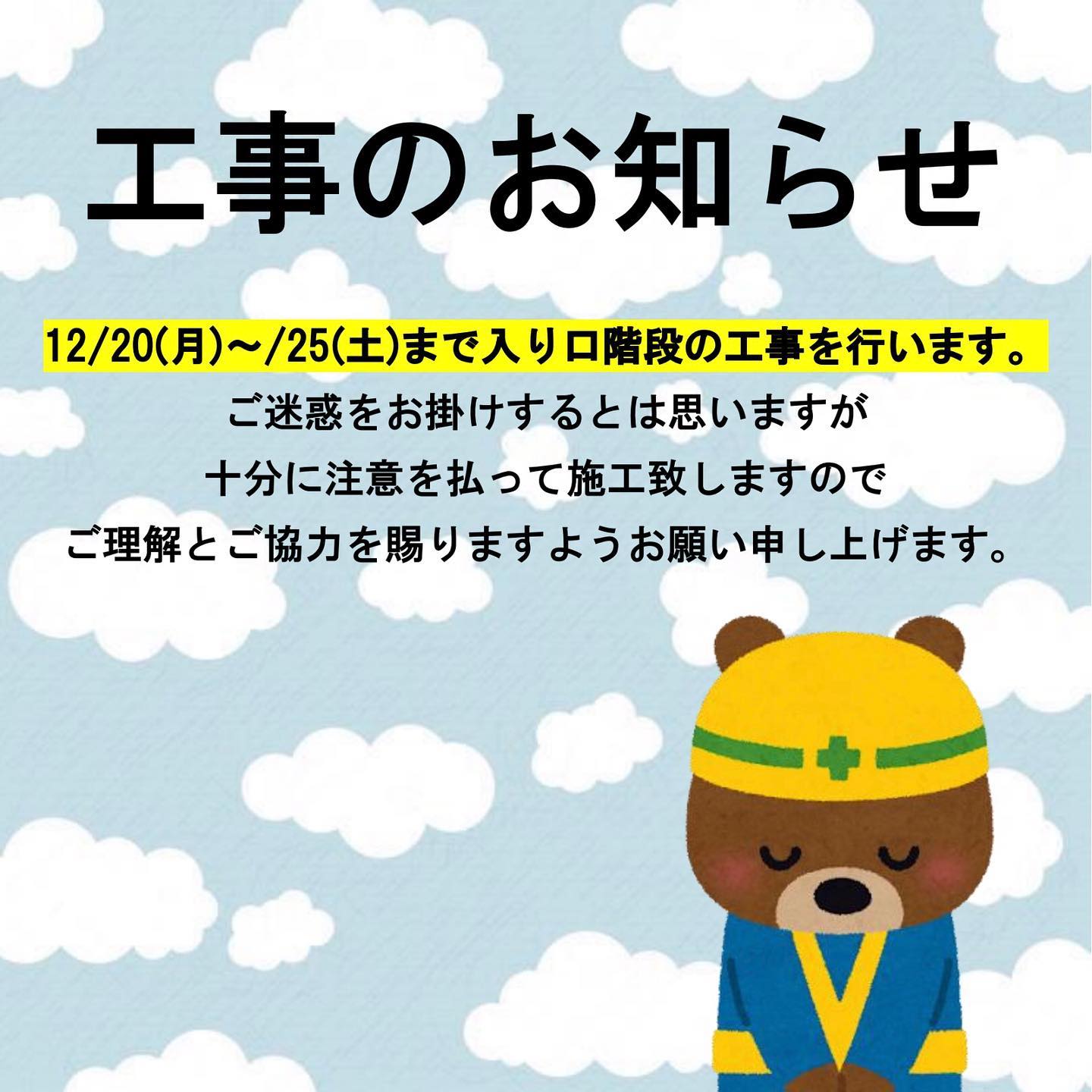 こんにちは!工事のお知らせです️当院入り口の階段工事を行います。期間:12/20(月)〜/25(土)患者様にはご迷惑をお掛けするとは思いますが、十分に注意を払って施工いたしますので、ご理解とご協力賜りますようお願い申し上げます。#矯正歯科クリニック柏の葉#矯正専門医#マウスピース矯正#表側矯正 #裏側矯正#拡大矯正 #小児矯正#柏の葉キャンパス駅 #徒歩4分#人生がときめく矯正を#山崎 -