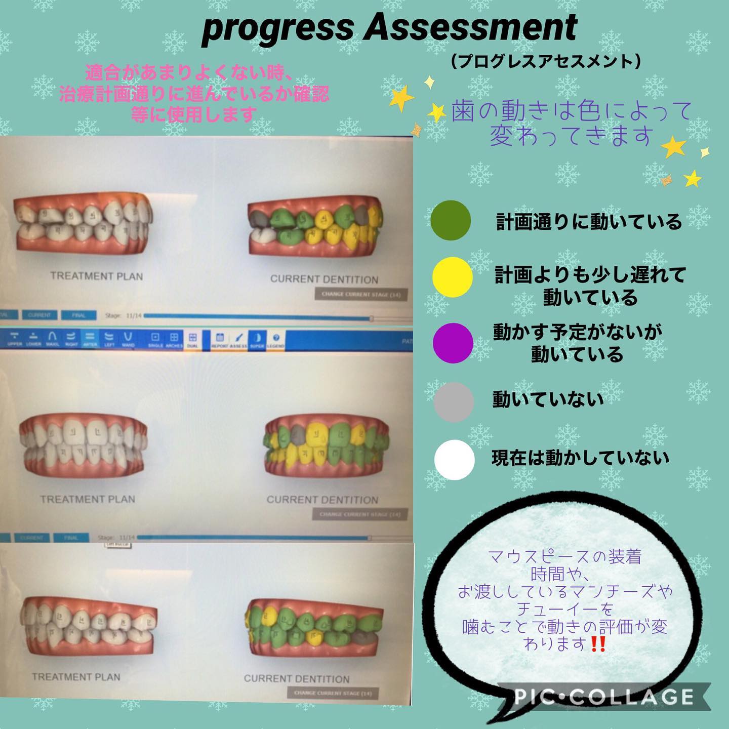段々と空気が冷たくなり、寒くなってきましたね️乾燥もしているので体調を崩しやすくなりますが手洗いうがいをして予防をしましょう今日はprogress Assessment(プログレスアセスメント)についてです。マウスピース矯正をされている方は見る機会があると思います・計画通りに歯が動いているかの確認・マウスピースの適合が悪い時・追加で作成する際などです。色で歯の動きを評価出来るので結果をみるとモチベーションにもつながります🤩マンチーズやチューイーをしかっり噛んでもらうこ... -