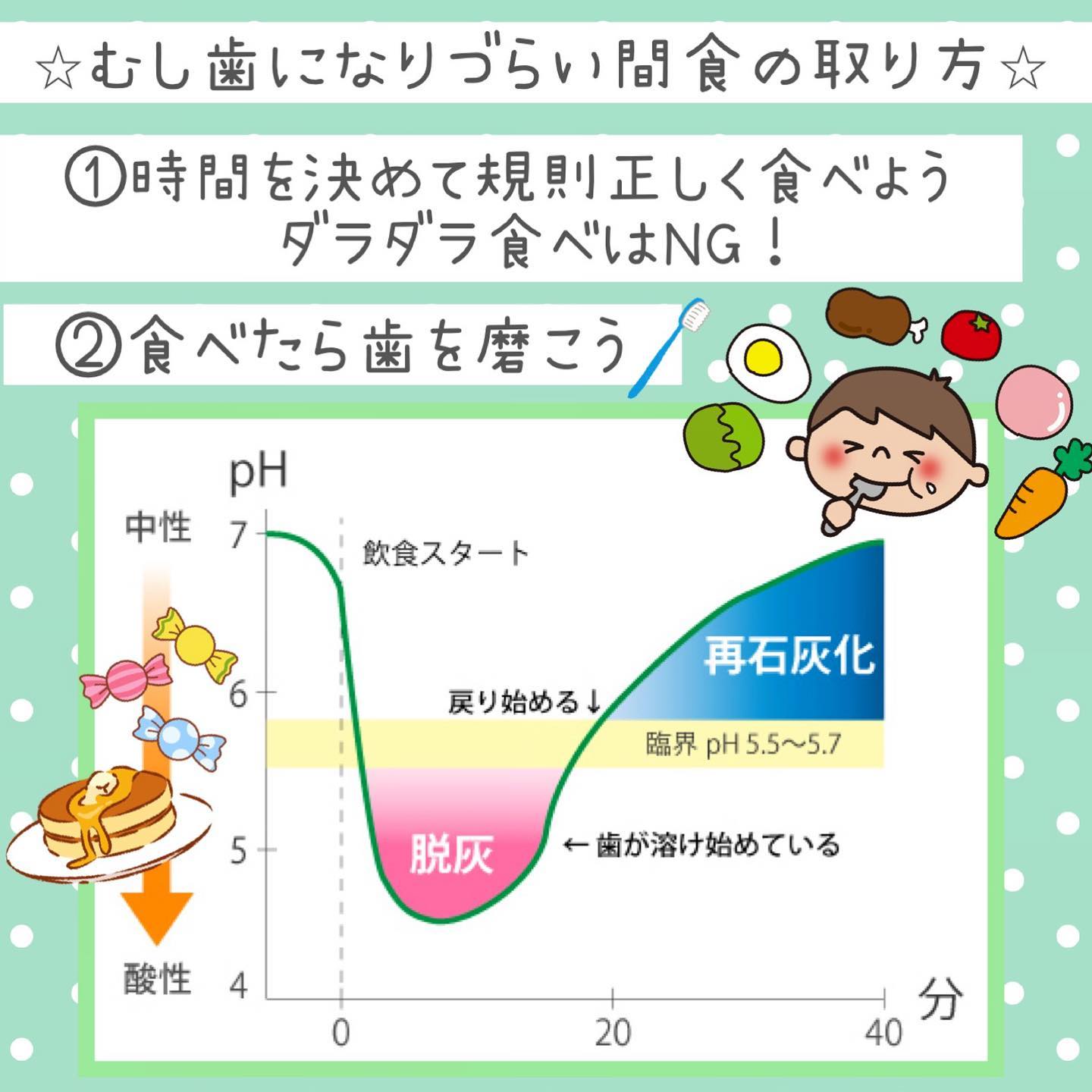 みなさんついついダラダラ食べしちゃっていませんか?🤭私もお休みの日など気を抜くとついついダラダラ食べてしまいます今回は当たり前のようですが、意識しないと出来ないむし歯になりづらい間食の取り方についてお話させてください!食べ物を食べるとお口の中は、酸性に傾きますそうすると歯の表面はザラザラに溶けた状態になってしまうんです通常、唾液の力で中性に戻して修復しようとしますが、ダラダラ食べ続けてしてしまうとずっとお口の中は酸性の状態...