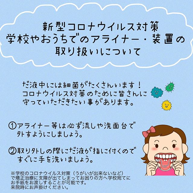矯正歯科クリニック柏の葉からお願いです♂️ 一斉休校が解除され学校生活がスタートしましたねですが、まだまだ油断が出来ない状況が続いています、、、唾液中にはたくさんの細菌がいるため、色々なところでアライナー・装置を外したりすると、唾液が飛び散ったり手に付着したりと感染のリスクが高まってしまいますアライナー等を外す時は必ず流しで行い、その後すぐに手を洗うようにしましょう今まで問題無くアライナーや装置を使えていた方もコロナ対... -