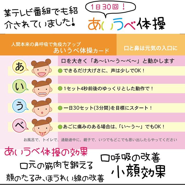 突然ですがあいうべ体操をご存じですか?ここ最近テレビなどでも取りあげられる事が多くなってきて知っている方も多いかと思います🤩🧡あいうべ体操にはお口を大きく開ける体操をするだけで様々な効果があるんですお口の周りにはたくさんの筋肉がありそれらの筋肉が鍛えられていないと、口周りの筋肉は垂れはじめ、たるみの原因にもなりますほうれい線も同様ですですが口周りの筋肉を鍛える事で逆の効果を得られる事ができます🤩🧡あいうべ体操を継続すると、口輪筋・... -