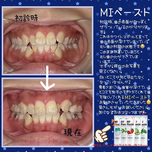 M Iペーストのご紹介です初診時のお写真は、全体的に歯がザラザラしていて白っぽく脆い状態です。歯磨きは毎日の積み重ねなので、自分でも気付かないうちに磨き癖が出てきます🦷そうすると、上手に磨けているところといつも磨けていないところが出てきてしまいます毎日汚れが残っているところは、お写真のように歯の表面が白っぽく溶けている状態になってしまうんです、、、このまま放置すると、ボコっとむし歯の穴が空いて治療が必要になってきます😈通常、... -