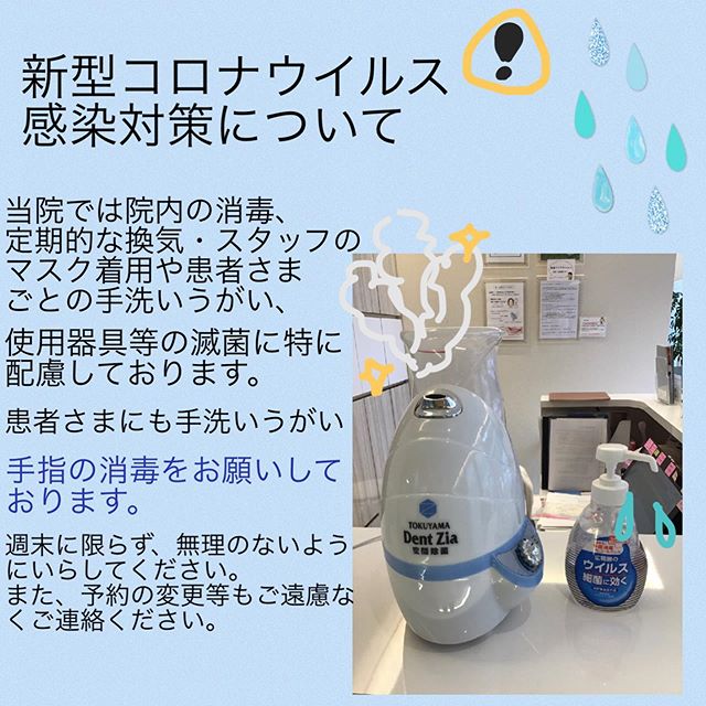 こんにちは!gwも明けあっという間に5月ですね新型コロナウイルスも未だに終息の目処がたちませんね当医院も引き続き、院内全体の消毒、スタッフの体調管理、ユニットの清掃や患者さまどうしの密室・密接を防ぐために、診療時間枠をずらしながらみなさまが安全に通院できますよう対応させていただいております。来院時は受付前の洗面台で手洗いうがい、来院された方みなさまに検温をお願いしております。クリニック内での感染防止のため大変ご面倒をおかけしますが何卒ご理解、ご協力の程よろしく... -