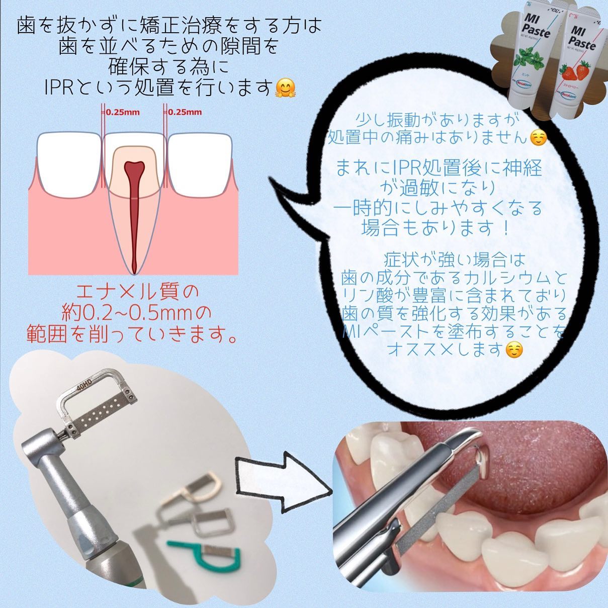 こんにちは久しぶりにお天気が続いていますね❣️歯を抜かずに矯正治療をされている方も沢山いっらしゃいますその際、歯を並べていくうえでスペースが必要になりIPRという処置を行います🤗IPRを適切に適用すれば、【治療期間の短縮】【矯正治療可能範囲の拡大】といったメリットがあります️IPRの目的は主に3つです。①スペース(隙間)を作ること②歯間乳頭の形成➂歯列の長期安定歯を削る=「怖い」「痛い」というイメージをもたれやすい処置ですが、IPRは痛みはなく、振動... -
