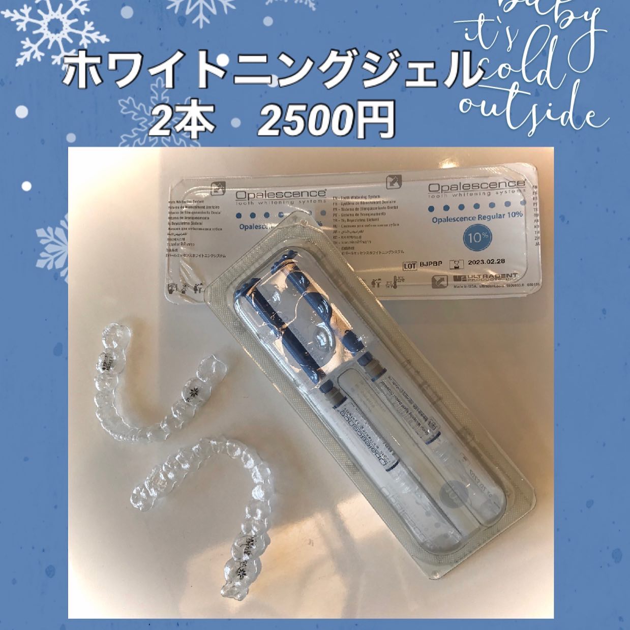 こんにちは❣️今日も寒いです🥶ホワイトニングジェルが2本セットで2500円で購入できます♀️️オフィスホワイトニングは高くてなかなかできなかったりしますが、ホームホワイトニングは自分のできる時間に行えるかつ安価でできますのでご興味ありましたらお声掛けください🦷インビザラインをお使いの方、これからインビザセットをしてアタッチメントがつく前のかたやアタッチメントがなくなった時にホワイトニングが同時に行えます❣... -