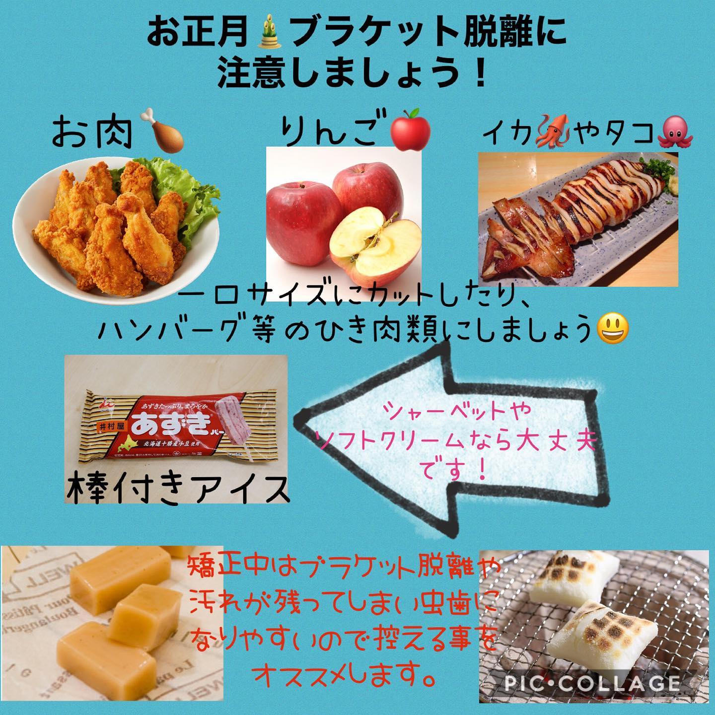 今年も残りわずかですね!クリスマスやお正月と美味しい物を沢山食べると思いますワイヤー矯正をされている方は食べる物に注意️をして下さいねブラケットがとれて不快な思いをしながら年を越すことのないように、日ごろから気をつけていきましょう#矯正歯科クリニック柏の葉#矯正専門医#マウスピース矯正#ブラケット#小児矯正#拡大装置#リテーナー#表側矯正#裏側矯正#柏の葉キャンパス駅#徒歩4分#人生がときめく矯正を#伊藤 -