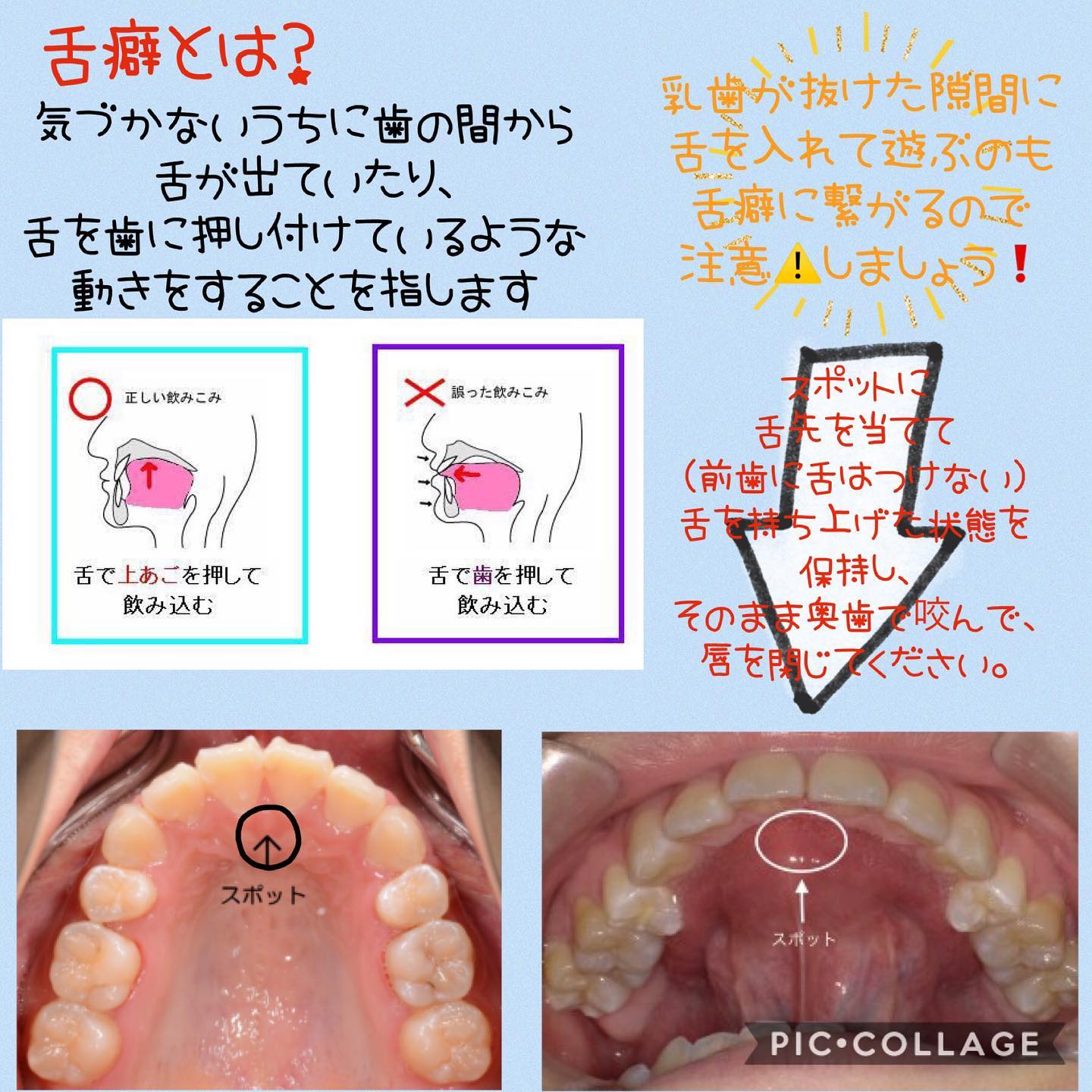 Merry Xmasご自宅で迎える方が多いかと思いますが、素敵な1日をお過ごしですか?矯正をされている方の中には舌のトレーニングをしている方がいます️なぜトレーニングが必要かというと、、、私達は1日に約1500回、無意識に飲み込む動作をしています️舌癖のある人は、飲み込むたびに舌で歯を押していることになりますその結果、歯と歯のすき間が開いたり、上下の歯がかみ合わなくなることがあります審美的な問題だけでなく、顎の骨や歯牙の機能的な咬合関係を阻害して不正咬合を誘発すること... -