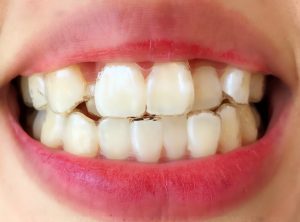 私の場合、(写真だと)左上の前歯の隣の歯が奥に入ってしまっているのが